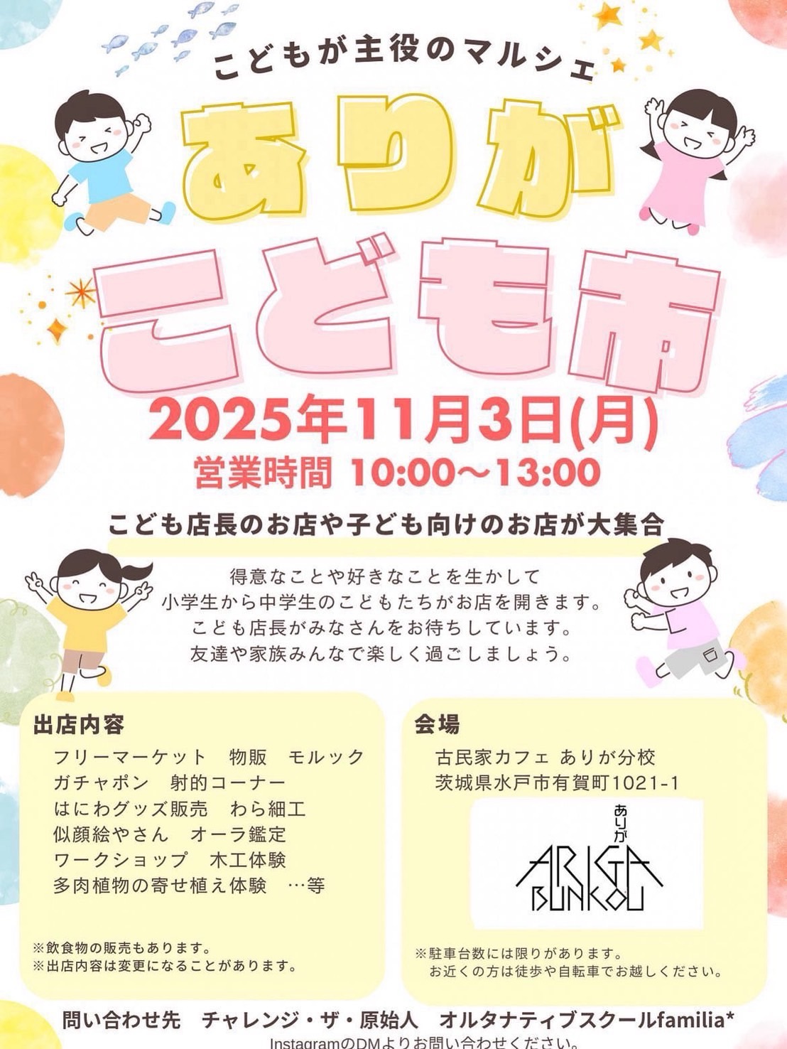 お知らせ2025年11月3日は、内原の「ありが分校」さんで開催された、こどもが主役の「ありがこども市」へ。